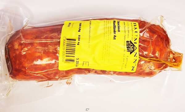 Schweizer Fleischerzeugnis zum Gekochtessen und geräuchtZutaten: Schweinefleisch, Rindfleisch, Schwarte, Wasser, Nitritpökelsalz (Kochsalz, Konservierungsmittel: E250), Gewürze, Hefeextrakt, Aromen, Gewürzextrakt. Wursthülle: Rindsdarm