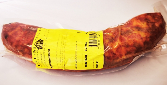 Schweizer Fleischerzeugnis zum Gekochtessen, geräuchtZutaten: Rindfleisch, Schweinefleisch, Speck, Schwarten, Nitritpökelsalz (Kochsalz, Konservierungsstoff: E250), Gewürze, Maltodextrine, Traubenzucker, Milchzucker. Wursthülle: Rindsdarm