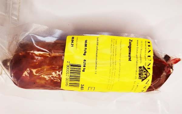 Schweizer Fleischerzeugnis gekocht und geräuchtZutaten: Schweinefleisch, Rindfleisch, Speck, Wasser, Nitritpökelsalz (Kochsalz,Konservierungsmittel: E250), Gewürze, Stabilisatoren: E450, E451, Milchzucker, Traubenzucker, Zucker. Wursthülle: Rindsdarm