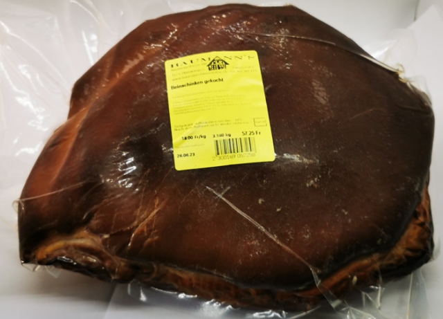 Schweizer Fleischerzeugnis gekocht, geräucht Zutaten: Schweinefleisch, Wasser, Nitritpökelsalz (Kochsalz, Konservierungsmittel: E250), Stärkezucker, Milchzucker, Traubenzucker, Gewürze, Säuerungsmittel: E331, Geschmacksverstärker: E621, Würze, Antioxidat
