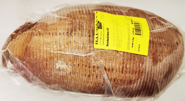 Schweizer Fleischerzeugnis gekocht, geräucht Zutaten: Schweinefleisch, Wasser, Nitritpökelsalz (Kochsalz, Konservierungsmittel: E250)