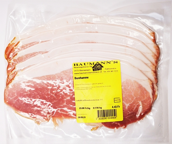 Schweizer Fleischerzeugnis gekocht, geräucht Zutaten: Schweinefleisch, Wasser, Nitritpökelsalz (Kochsalz, Konservierungsmittel: E250)