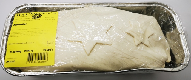 Schweizer Fleischerzeugnis zum Gekochtessen Zutaten:Schweinsfauxfilet, Blätterteig, Kalbsbrät (Kalbfleisch (50%), Schweinefleisch, Speck, Wasser, Schwarten, Kochsalz, MILCHeiweiss, MILCHzucker, Traubenzucker, Gewürze, Stabilisator: E450), Bratspeck, Cha