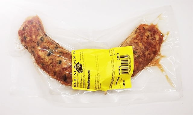 Schweizer Fleischerzeugnis Zutaten: Schweinefleisch, Speck, Wasser, Kochsalz, 2% Bärlauch, MILCHeiweiss, MILCHzucker, Traubenzucker, Gewürze,.Wursthülle: Schweinsdarm