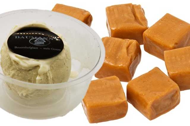 Zutaten: VollMILCH, RAHM, EIgelb, Glukosesirup, 7.35% Karamellstückchen (kondensierte MagerMILCH (gesüßt), Zucker, Glukosesirup, BUTTERfett, Feuchthaltemittel (Sorbitsirup), Emulgator (Mono- und Diglyceride von Fettsäuren)), 6.99% Karamellpaste (Invertzucker) SalzTiefgekühlt aufbewahren bei min.-18°C