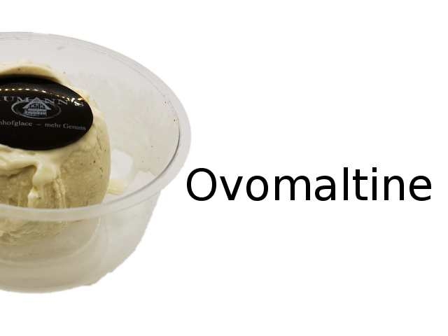 Zutaten: VollMILCH, EIgelb, Dextrose, RAHM, 8.93%, Zucker, Emulgator (SOJAlecithin)), Zucker, Glukosesirup, Ovomaltine 8%, (Gerstenmalzextrakt, kondensierte MagerMILCH, fettarmer Kakao, Mineralstoffe, Rapsöl, Vitamine), Fruktose, Verdickungsmittel (Johannisbrotkernmehl) Salz, Tiefgekühlt aufbewahren bei min.-18°C